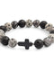 Ein wunderschönes Armband mit Kreuz und Perlen in einem fröhlichen Muster. Jedes dieser Naturmineralien hat eine andere Struktur, doch zusammen bilden sie ein interessantes Ganzes mit einer abwechslungsreichen Textur in Schwarz- und Weißtönen.