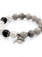 Eine wunderschöne Kombination aus mattem Jaspis und schwarzer Lava mit glitzernden, leichten Perlen aus gecracktem Quarz. Der Rosenkranz ist mit Kappen und Zwischenstücken aus Edelstahl verziert und wird durch zwei Edelstahl-Anhänger – ein Herz und ein Kreuz – abgerundet.