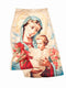 Kresťanská sukňa s potlačou Márie s Ježiškom je netradicný kúsok, ktorý svojím posolstvom a estetikou očarí každého. Sukňa je v dĺžke pod kolená, z padavého splývavého elastického materiálu s jemným pololesklým povrchom. Krásny motív v sýtych farbách je dominantný, preto je dobré sukňu kombinovať s menej výraznými ďalšími časťami oblečenia. Sukňa má jednoduchý pás na gumičku. Dĺžka siaha zhruba do polovice lýtok. Na zadnej strane je sukňa jednofarebná, v základnej béžovo - marhuľovej farbe. Táto krásna sukňa je vhodná na špeciálne prílležitosti, keďže pôsobí slávnostne a veľmi originálne. Ale i nedeľná návšteva kostola môže byť takouto oslavou viery.